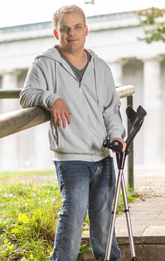 Heute bin ich erwachsen und stehe in meinem Leben. Mit einer angeborenen Spastik muss ich auf Gehstützen laufen und habe gelernt mit den Herausforderungen des Lebens umzugehen.
